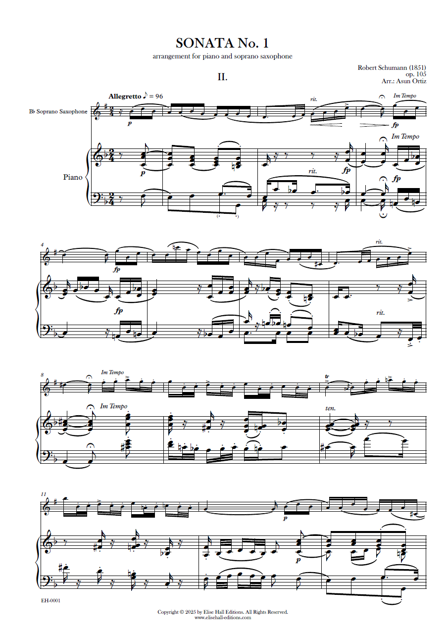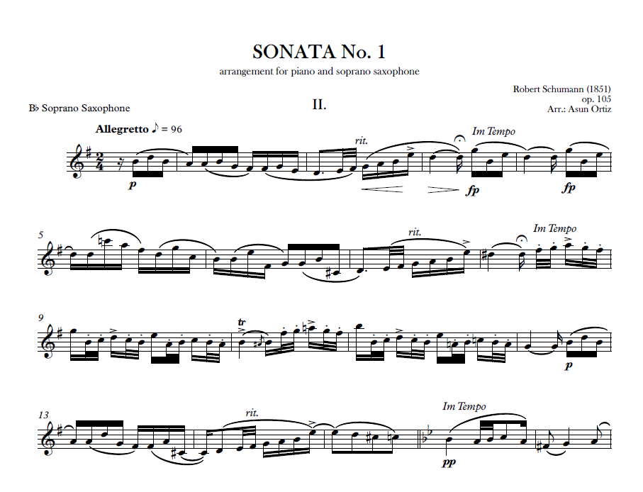 Esta versión para piano y saxofón soprano ofrece una perspectiva renovada del movimiento, respetando la expresión íntima del original y, al mismo tiempo, aprovechando la riqueza tímbrica del saxofón. La adaptación busca preservar la articulación y el fraseo característicos de Schumann, permitiendo que el instrumento respire con voz propia.