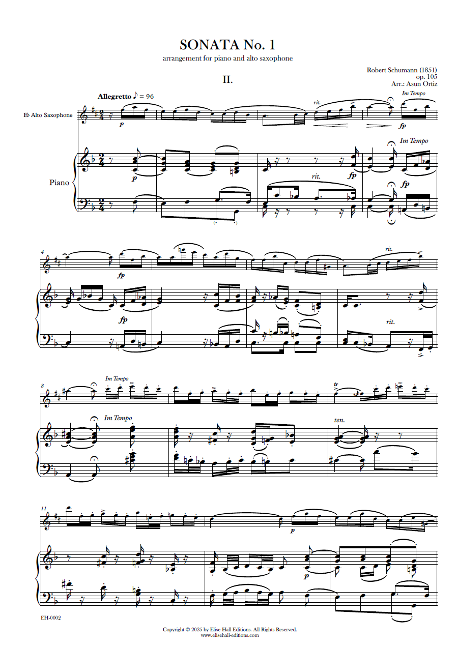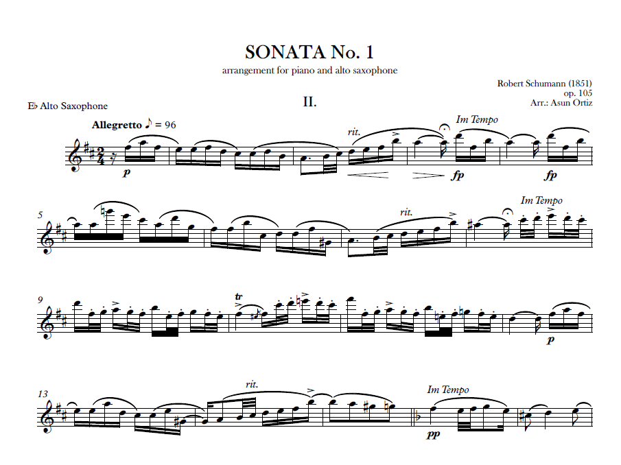 Esta versión para piano y saxofón alto ofrece una perspectiva renovada del movimiento, respetando la expresión íntima del original y, al mismo tiempo, aprovechando la riqueza tímbrica del saxofón. La adaptación busca preservar la articulación y el fraseo característicos de Schumann, permitiendo que el instrumento respire con voz propia.